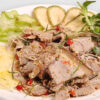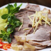 Chờ bê nguội, đeo găng tay và thái mỏng bày ra đĩa, rắc chút vừng rang thơm, gừng thái sợi để tăng thêm hương vị và bắt mắt cho món ăn.
